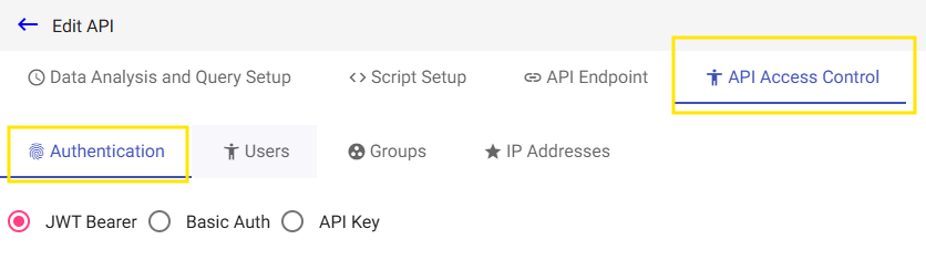 Navigate to the API Access Control ,You can select who should have access to the API here. You can also select one of the three authentication methods. JWT Token based, Basic Authentication and API key based. (Read more about using each authentication type, along with examples, in the API Access Control document, under Authentication category)